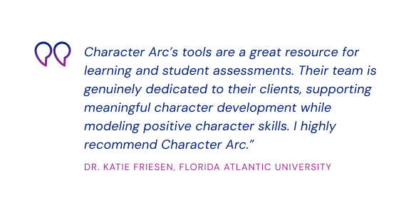 Character Arc’s tools are a great resource for learning and student assessments. Their team is genuinely dedicated to their clients, supporting meaningful character development while modeling positive character skills. I highly recommend Character Arc.